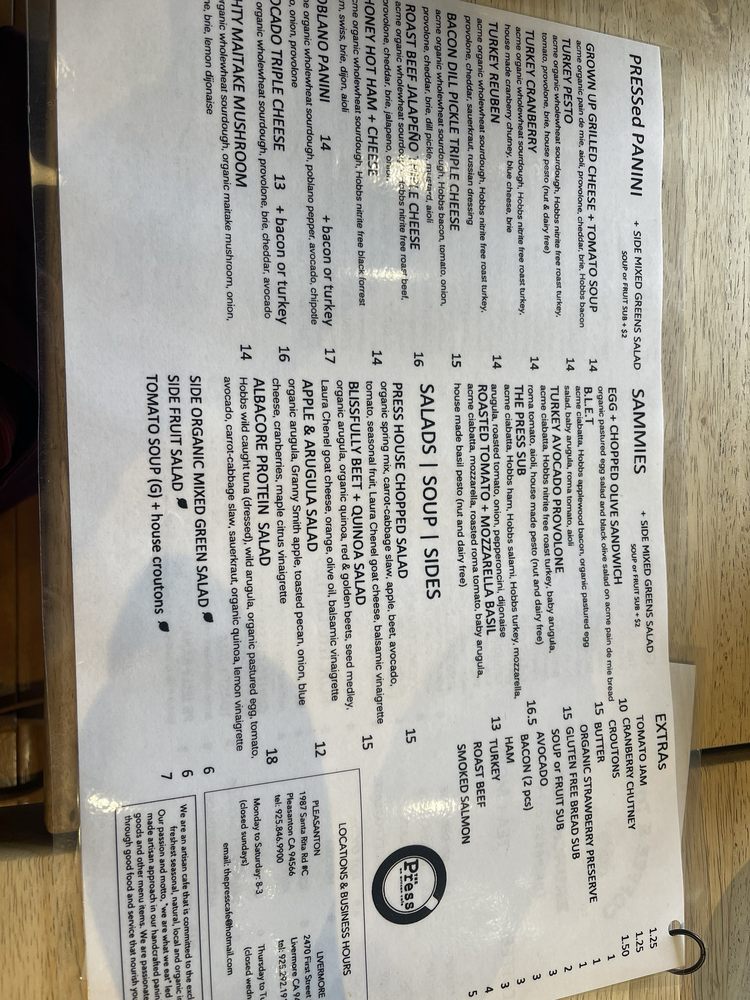 "The Press - Livermore" is a trendy breakfast and brunch spot located in Livermore, CA. This women-owned establishment offers a wide range of delicious dishes, including unique options like the Pear Caramel Chai Steamer and Pear Chevre Toastini. The ambiance is hipster, casual, and classy, catering to a young crowd. One standout item on the menu is the Harvest Pear Panini, which combines savory bacon with sweet fruit for a delightful flavor profile. The cafe mocha is also highly recommended, with a perfect balance of sweetness and rich mocha flavor. The efficient service and thoughtful staff add to the overall positive dining experience. Whether you're in the mood for a refreshing lavender lemonade or a decadent peppermint mocha, "The Press - Livermore" is a must-visit for delicious food and great service.